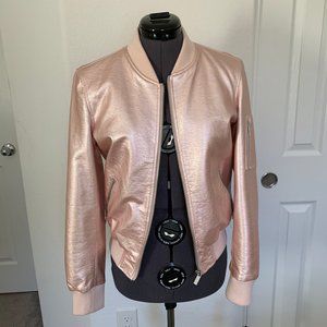 Beautiful metallic pink! Two side zipper pockets and one fully function pocket on left sleeve. Size S. No flaws. The ribbed fabric on the hem and cuffs has a tendency to slightly pill inside, but is easily removable by running a new disposable razor over the fabric.
