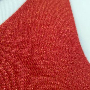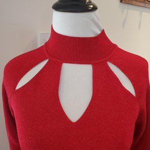 -Metallic red long sleeve mock neck sweater. Shade of red is cherry
