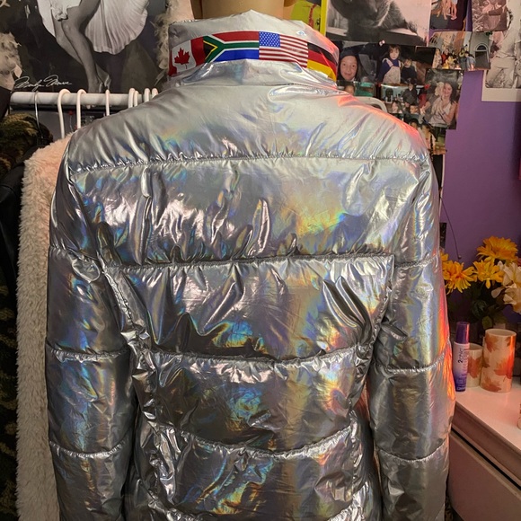 Super unique retro jacket, never worn, has flags on the back of the neck to add a personal touch. It is perfect to take pictures in, and definitely something that not a lot of people have! It is a large but runs small