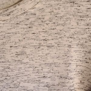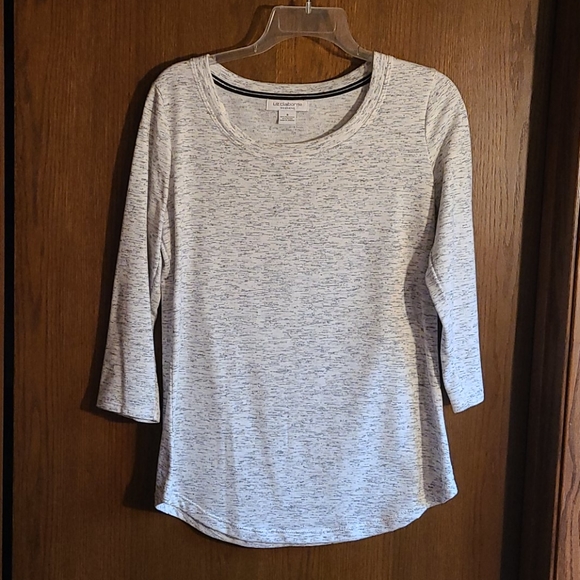 This adorable tee is 65% polyester and 35% rayon. It measures about 26 inches from the shoulder to the hem and 38 inches around the bust. It features a scoop neckline and 3/4 sleeves in shades of black, gray and silver on a white background. Machine wash cold and line dry.