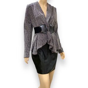 Black gray long sleeve lightweight ruffled tiered open front metallic cardigan.