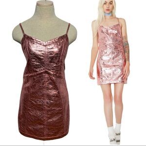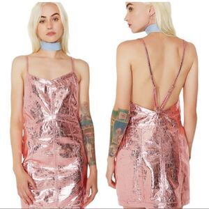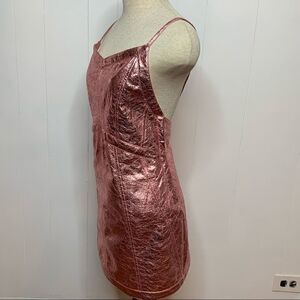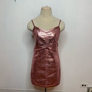 90’s-inspired mini dress featuring a rose metallic pleather construction, low cut arm openings, full lining, intricate front seams, adjustable shoulder straps, sexxy pointed low back and side zipper closure.