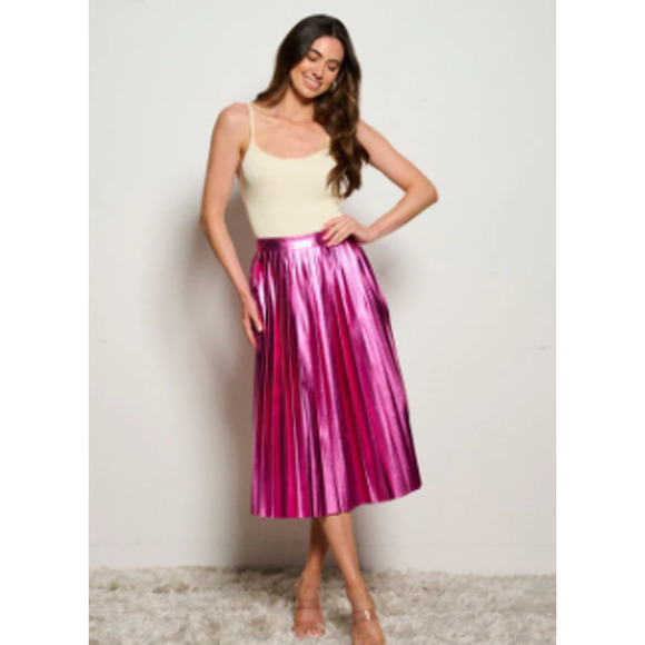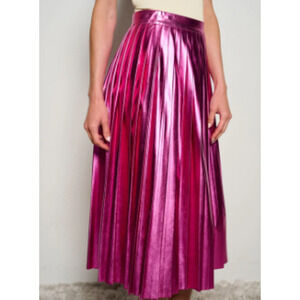 Pink metallic pleated skirt with zip closure.