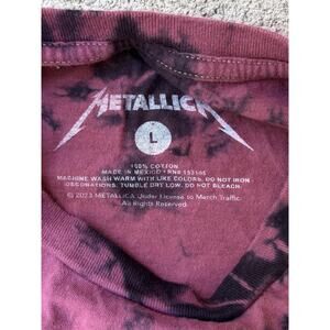 This Metallica In Vertigo Tie Dye T Shirt is a must-have for any rock or heavy metal enthusiast. Featuring the iconic Metallica logo and a vibrant red tie-dye pattern, this short sleeve shirt is made from comfortable cotton material and has a crew neck for a classic look. The size is large, perfect for a regular fit, and it is machine washable for easy care. With a graphic print and a theme of heavy metal, this shirt is a stylish and unique addition to any music lover's wardrobe.
