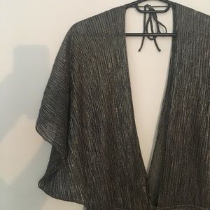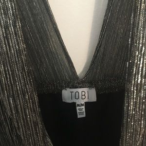 Black/metallic gold shiny Tobi Romper. Size M, short, and deep v-neck. Perfect condition.