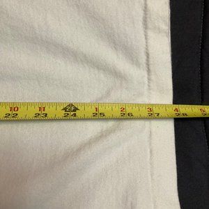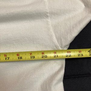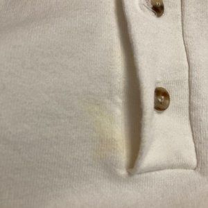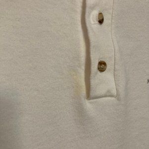 The shirt has a faint spot on it, not sure what from. I never wore the shirt so somehow it got a stained in storage. I think it might come out and it is even hard to photo. It is to the left of the bottom button. Other than this it is in great condition. It is an off while short sleeved polo type shirt. Material is a little heavier than t-shirt material.