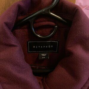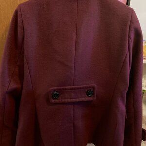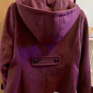 Maroon Coat with double breasted black buttons and 2 front hip pockets. Hood is removable.