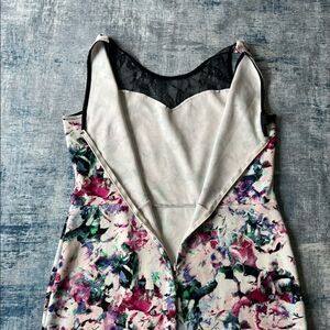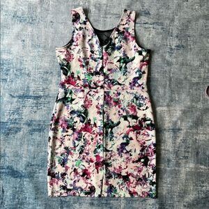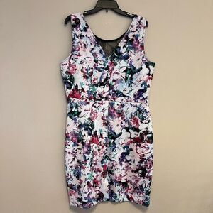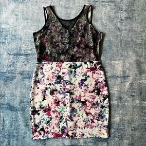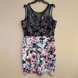 Metaphor Sleeveless Watercolor Abstract Floral Bodycon Dress w Lace Overlay XL