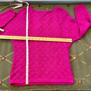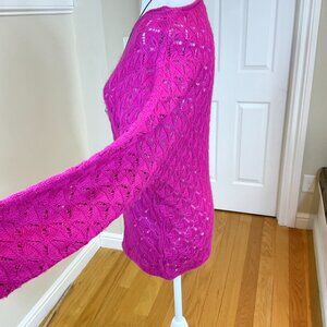 Beautiful vibrant open knit sweater, beachy, boat neck, batwing long sleeves, magenta color