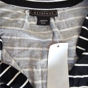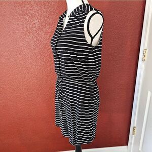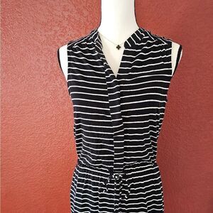 Sleeveless dress with a classic striped pattern. Features a tie waist for a flattering fit. Perfect for casual outings. Brand new.