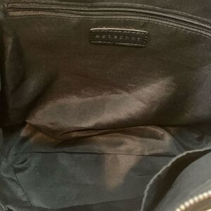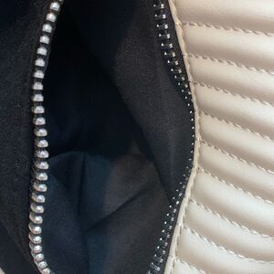 Beautiful black and cream handbag with calf suede panel, quilted accents and exposed front slit zipper pockets. Soft and supple bag,You’d never know the main body is not leather. Large zipper compartment inside as well as open pockets. Never carried, but may have minor creases from storage.