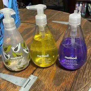 3 bottles of Method hand soap. 1 missing pumper, and some is missing from that one too. These translucent liquid soaps are housed in stylish teardrop-shaped bottles, perfect for adding a touch of elegance to your bathroom decor. Enjoy the gentle formula that leaves your skin feeling soft and rejuvenated.