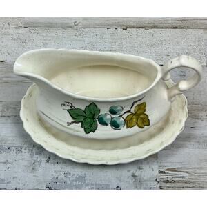 Metlox Gravy Boat Bowl Server Vernon Ware Vineyard Stoneware Pottery Vintage USA. This piece is in excellent pre owned condition. See photos for details. Beautiful for fall. See other pieces of this collection in our store.
