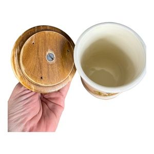 Cute little canister. I think this this is the smallest of a larger set. Excellent condition. The wood on the top could use a little conditioning but there are no actual flaws. Stamped on the bottom.