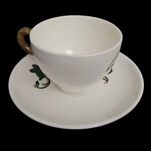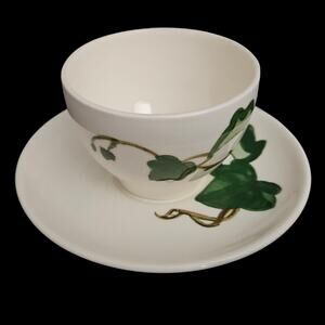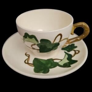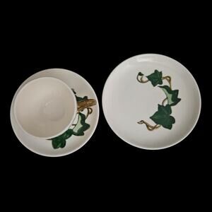 This classic mid-century pattern, produced in California from the 1940s–1970s, features hand-painted green ivy leaves and trailing vines, with a golden-brown handle on the cup. A highly collectible and iconic American dinnerware pattern.