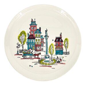 This set of vintage dinner plates showcases the charming City Scene design, skillfully crafted by Metlox Poppytrail. Each plate features a vibrant, detailed cityscape illustration, making it an excellent addition to curated collections or a tasteful table setting. Made in California, these plates embody both functionality and artistry.