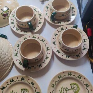 The set contains a covered Casserole, 4 cups and saucers & 2 desert plates. Vintage Good Quality with a chip on the lid of the casserole handle and a flea bit repaired cup. Casserole lid is a little wonky, and sits a little off center.The rest of the collection are in Very good condition. I would describe these as Special Occasion pieces for Thanksgiving or Christmas. They are very cheerful and farmcore.