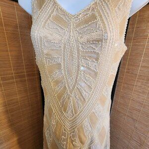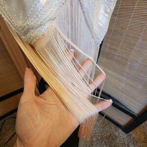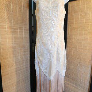 Creamy-Dreamy fringe gown by Metme. This amazingly beautiful cream colored vintage dress is New With The Tags still on it. What a dreamy dress, size XS, cream lace & sequins with bottom fringe, fully lined with a side zipper. I cannot say how lovely this dress is in person. Weather it is for a costume or for an elegant evening out you will feel like a princess and like dancing the night away swirling and twirling making the fringe fly! Be the stunning princess you truly are.
