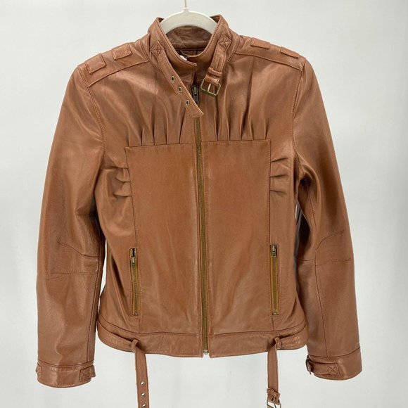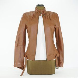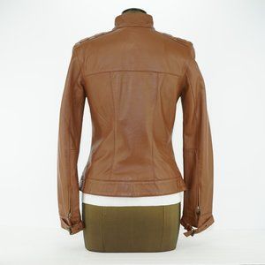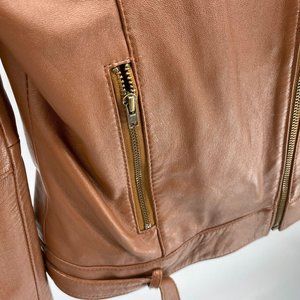 Tags: moto jacket, genuine leather top, biker leather jacket, buckle cuff hem, detailed leather jacket
