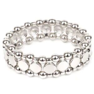 Shiny silver disc fittings and pairs of classic silver beads are threaded along stretchy bands around the wrist that connect into a bold industrial display around the wrist.