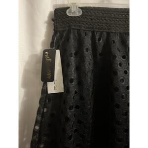 The Metro Wear Black A Line Skirt with Circle Cut Outs is a stylish and versatile piece perfect for various occasions. This knee-length skirt features a perforated pattern and a hippie character, making it ideal for a festival or bohemian-themed event. Made from lightweight polyester material, this skirt is lined, has an elastic waist for comfort, and is suitable for all seasons. The black color and A-line silhouette give it a classic yet on-trend look, while the pull-on closure and hand wash care instructions ensure easy maintenance. Perfect for petites looking to add a touch of art and hippie flair to their wardrobe.