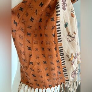 A super cute scarf for upcoming autumn! This is a patterned orange and brown scarf from Metrocity, lightweight and tasseled. One size, long so it can be wrapped around your neck multiple times. It has an eclectic mix of items on the scarf, Ferris wheels, rocking horses, bows, etc. No major signs of wear, a really beautiful scarf that can be paired with your favorite chunky sweater or casual top.