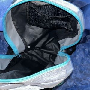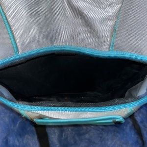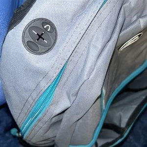 Metropack Backpack with headphone port. Gray, Black and Green colors. Double compartments. Double side drink holders. Requires new mid-zipper. Main compartment zips. Contains inside pouch for cell phone, keys, etc. Dimensions 12” x 6.5” x 18”.