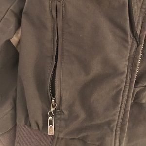 Charcoal grey zip up jacket with black lined detail. Side pockets that zip open and closed. Snaps at the collar. Very comfortable.