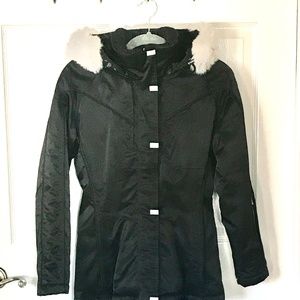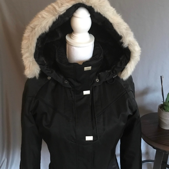 Fabulous black designer Metropolis jacket with front full-length zipper and signature metal snaps. Detachable faux fur-lined hood. Five outer pockets: sides, two front zipper pockets & one zipper pocket on left sleeve below the brand medallion. Two interior pockets for sunglasses, cell phone, keys, lipstick or small items. Snap cuffs. Perfect condition. Size 4 petite runs snug in hips and waist; wider in shoulders. Be comfortable, warm and stylish this winter! Retails for $600+