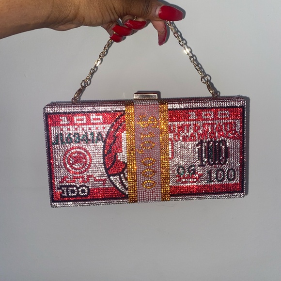 Make a bold entrance with this eye-catching rhinestone money clutch featuring a sparkling cash-inspired design and structured box silhouette. Covered in multicolor crystals with a luxe glam finish, this statement bag is perfect for birthdays, parties, nightlife, concerts, and special events.