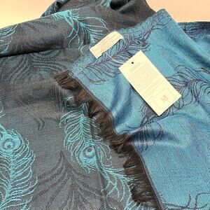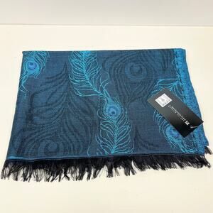 New 76" x 28" scarf shawl with peacock feather design adapted from a woodcut by Maurice Pillard Verneuil. Made of a silk wool blend.