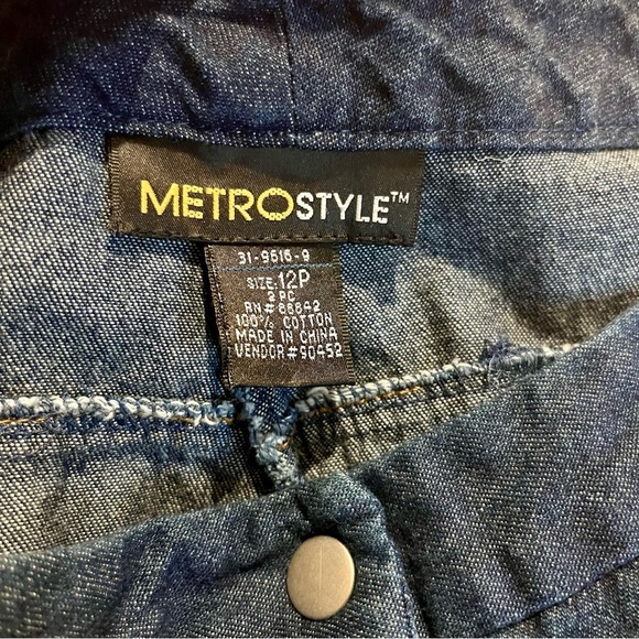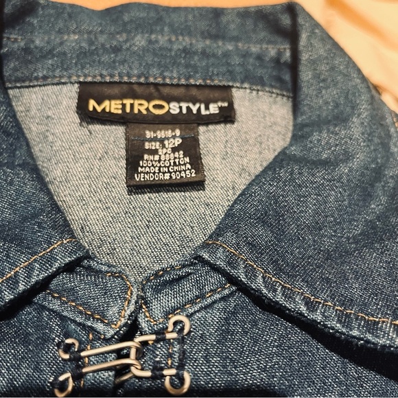 Classic blue denim jacket by Metrostyle. Features a high waist with stylish button details. The Jean set can be worn together or separate.