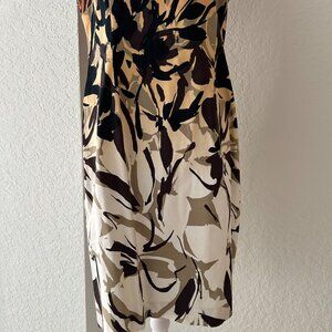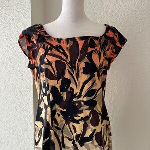 Striking figure flattering midi dress features a scoop neckline with cap sleeves and back slit. All-over floral design in earthtone shades. Back zipper enclosure. Fabric: 98% Cotton/2% Spandex. Measurements: from top of shoulder to hemline, 37"; armpit to armpit, 19"; waist, 16.5"; hips, 20.5". Great condition.