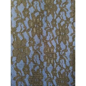 Style: Lace overlay open blazer style jacket. Crew style rounded neckline. Open down front, no closure. Long sleeves with slight puff at seam. Fully lined. Longer line to hips. Lace pattern overlays blue underlayer. Faux hip pockets. No stretch. 95% Polyester, 5% Nylon. Dry Clean Only. Made in China.