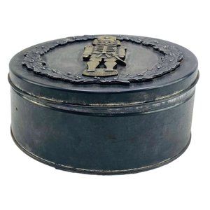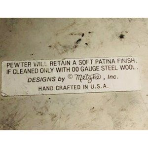 For sale is very rare vintage Holiday Toy Soldier with Holly Wreath pewter , brass container Made in the USA by Designs by Metzke INC. in 1984.This is made of pewter. It’s heavy and weighs almost a pound. It measures 8" across and is 3 1/4" tall. I'll let the pics will tell the rest of the story. The picture with the bottom sticker fell off, but it shows how to care of this beautiful piece.