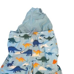 The Mevireiy swim shorts for boys, available in size 10-12, feature a playful dinosaur print in blue. Designed for summer, beach, and pool activities, these swim bottoms are made from quick-dry fabric. They include an elastic waistband, adjustable drawstring, and side pockets for convenience. Suitable for recreational use, they are machine washable for easy care. Condition: New.