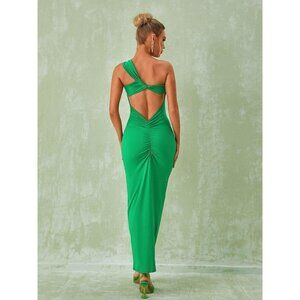Description from retailer: This Emi One Shoulder Backless Maxi Dress is designed to flatter the figure and add an elegant look to any outfit. The one shoulder design and backless cut provides a bold statement while its maxi length allows for maximum comfort and flexibility. The green color brings a lively feel and adds a touch of femininity.