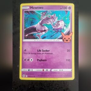 Mewtwo Pokémon card featuring a purple design with a yellow border.