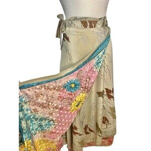 Long Sari Magic Skirt, a one-of-a-kind wardrobe essential handmade from upcycled sari silk in Jaipur, India. Each of these recycled silk wrap skirts is entirely uniquecrafted from layers of pre-loved fabric, offering you a wearable piece of global textile art.
