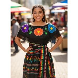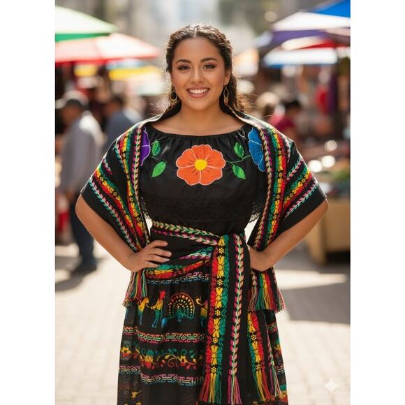 Mexican 3 piece set Blouse Cambaya skirt elastic waist and belt or mini rebozo