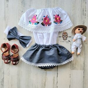 Brand new, Mexican outfit great for Cinco de Mayo. Blouse features embroidered flowers which may vary in color and design. Includes headband.