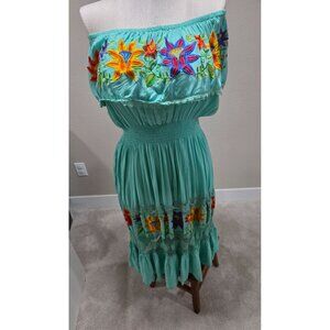 Mexican Boho Maxi Dress With Floral Embroidery & Lace Details Turquoise Color El