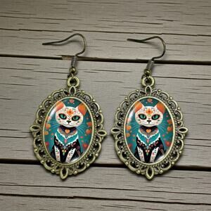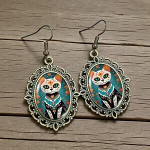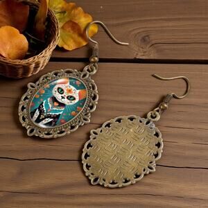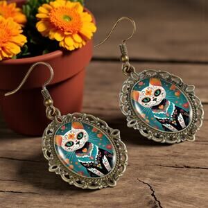 Celebrate culture, color, and creativity with these Mexican Day of the Dead Cat Earrings. Featuring a vibrant floral Dia de los Muertos cat design, these earrings blend vintage charm with festive Halloween spirit. Crafted from **durable alloy and enamel, they showcase rich tones of teal, orange, red, and golden accents—perfect for adding a bold pop of personality to any look.