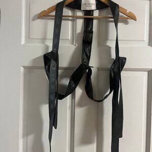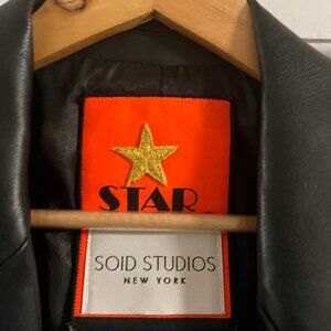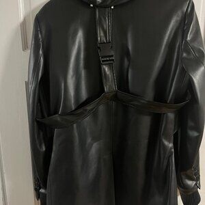 one of a kind Soid Studios New York jacket from Mexican Designer Jose Gonzales who works with up cycled materials and recently had a fashion show at Brooklyn Museum. Smooth sexy material. Very comfortable. dramatic cut outs in hips, for cropped and long feel. Fits a medium. Unique belt strap accessory can be worn over back shoulders or removed.