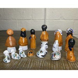 Mexican Folk Art 13 Pc NATIVITY SCENE Tonala Pottery Christmas Décor Green Brown.