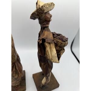 This pair of vintage-style Mexican folk art figurines is handcrafted from natural materials such as corn husks and bark paper, mounted on square wooden bases. Each figure stands approximately 12 inches tall and represents a rustic market scene with beautiful cultural detail.