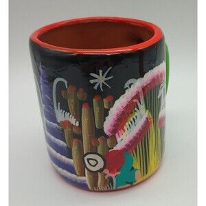 Mexican Folk Art Mug Redware Hand painted Cactus Glitter Red