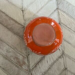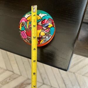 The Mexican Folk Art Trinket Box is a beautifully handcrafted terra cotta piece with intricate hand-painted designs. Made in Mexico, this round box with a lid is a unique and culturally significant piece of Mexican artisanal craftsmanship. The vibrant colors and traditional motifs make it a standout decorative item for any space, showcasing the rich heritage and artistic flair of Mexican culture. Signed by the artist, this trinket box is a one-of-a-kind piece that would make a charming addition to any collection or home decor.