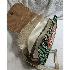 This beautiful backpack features a floral pattern and a triangle shape with a zip and snap closure. The bag is medium-sized with a width of 13 inches and a height of 14 inches. The exterior is made of faux leather in a multi-colored finish, and the bag comes with an adjustable strap for comfortable wear.