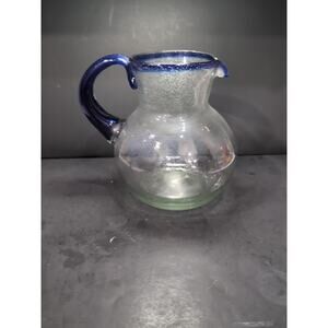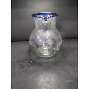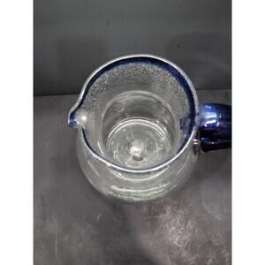 Mexican Hand Blown Glass Pitcher, Cobalt Blue Rim, 160 Oz Bubble Pitcher